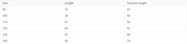 - Sizes Available: 90 (Height: 75cm-85cm), 100 (Height: 85cm-95cm), 110 (Height: 95cm-105cm), 120 (Height: 105cm-115cm), 130 (Height: 115cm-125cm), 140 (Height...)
